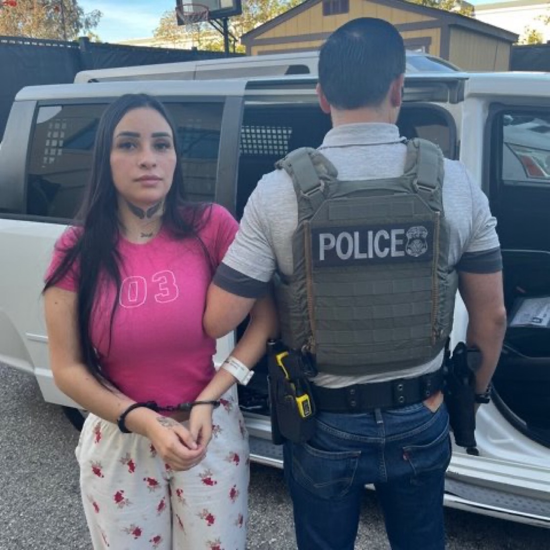 This post had a photo of Riveros-Diaz as she was being handcuffed and put into a police van. She is wearing a pink shirt and flower pajamas and has neck tattoos.