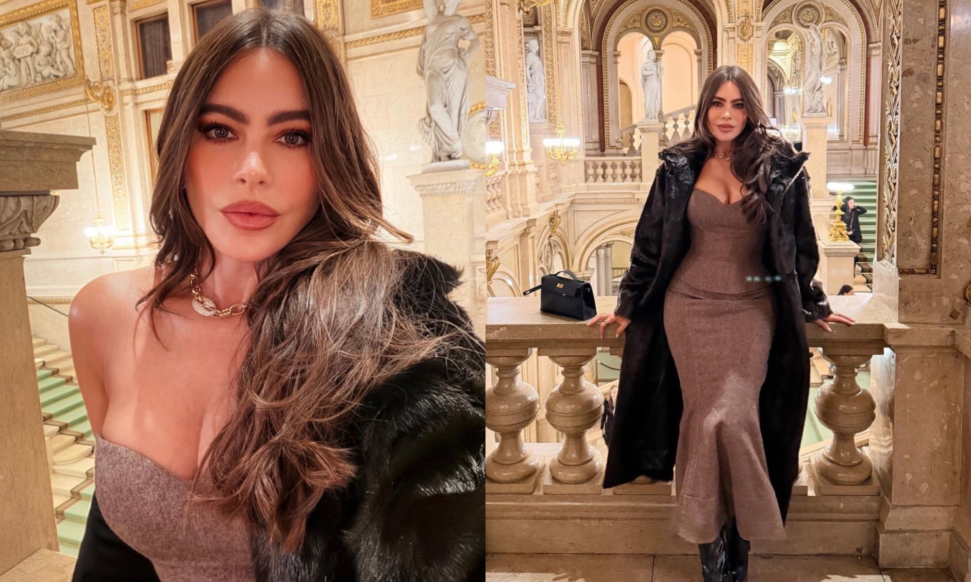 The first photo features a close-up self-portrait in an ornately decorated hall with statues and marble stairs in the background. Vergara wears a strapless brown top, a black fur coat, and a gold chain necklace. In the second photo, Vergara stands on the balcony in the same luxurious setting, wearing her brown midi dress, black boots, and a small black handbag.